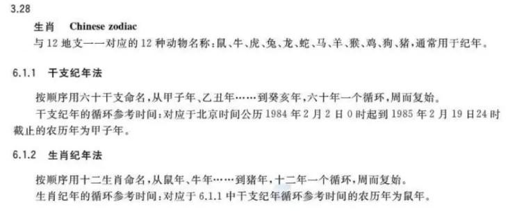 然后,我找到了国家标准《农历的编算和颁行》GB/T33661-2017。第3.28条、第6.1条,定义了“生肖”和“生肖纪年法”的概念,详见附图。