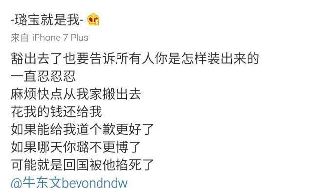 而后,王璐更是晒出了网友私信,有网友称自己有室友同牛东文交往过,并称牛东文确实会打人,丢东西,还会花女生的钱,而牛东文到目前为止还未对此事作出回应。