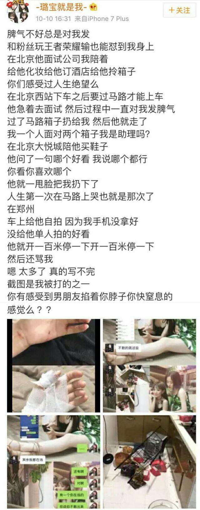 而后,王璐更是晒出了自己被牛东文暴打的照片,称牛东文不仅住在自己家,花自己的钱,还会掐她脖子。照片中王璐的手掌满是伤痕,家中的物品也被打翻在地。并配文说截图是自己被打的之一,你有感受过被男朋友掐着脖子快要窒息的感觉吗?