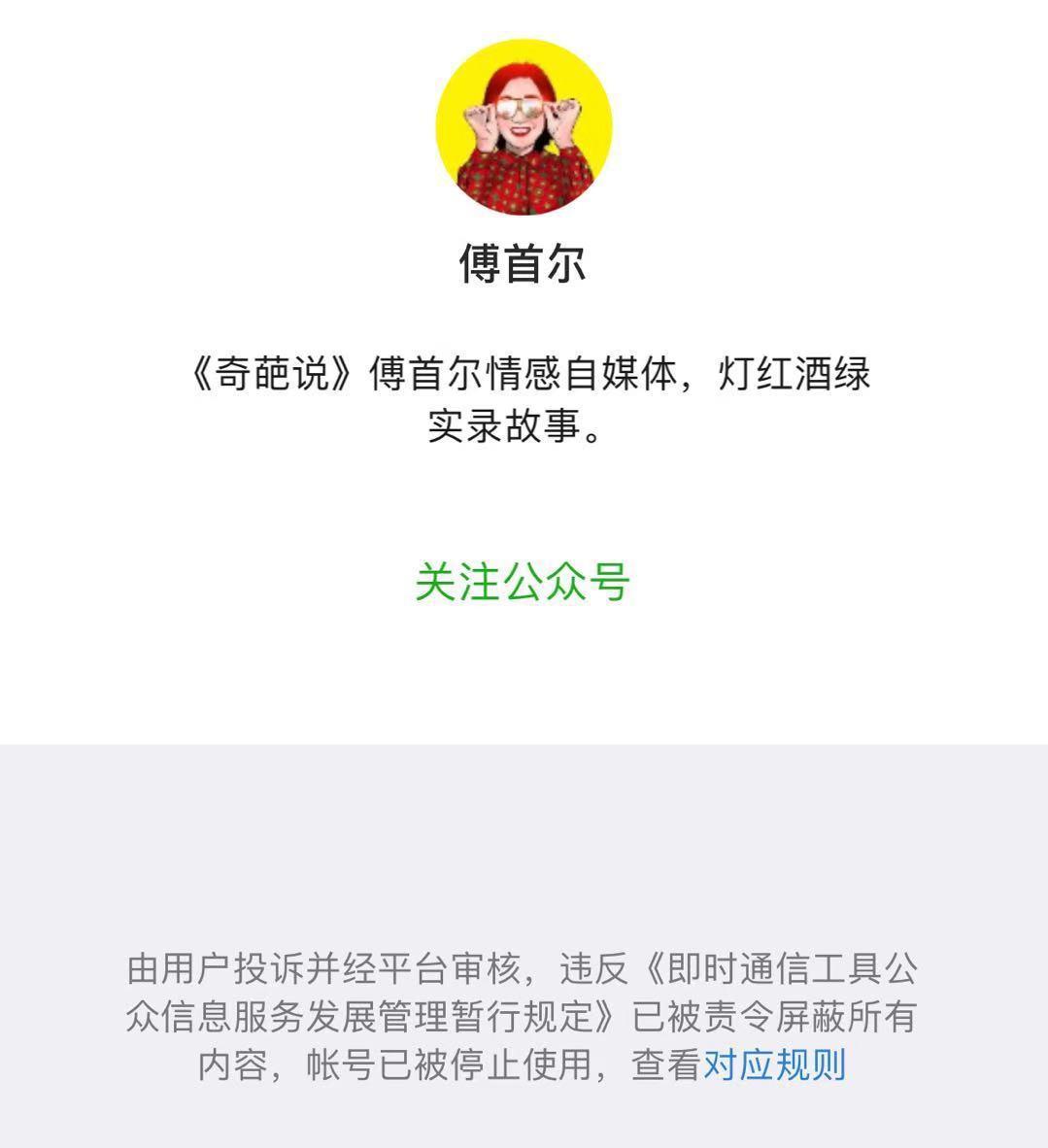 从傅首尔微信公众号的定位来看,应该是犯了【有的肆意传播低俗色情信息,违背公序良俗,挑战道德底线,损害广大青少年健康成长】这一条吧。