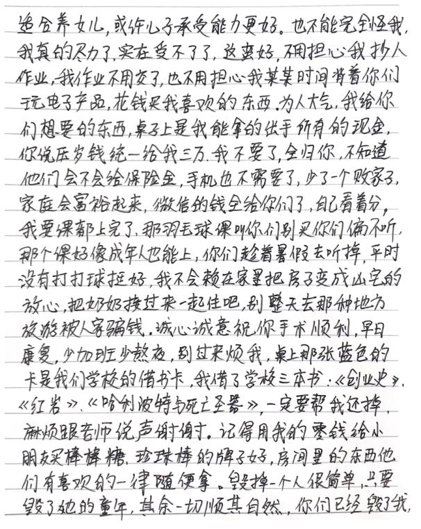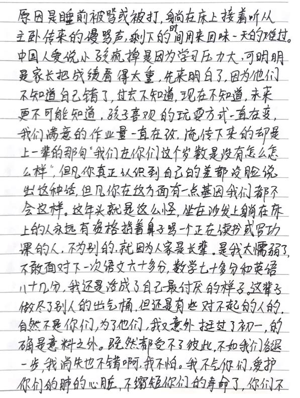 这是我从网络上誊抄的一份遗书,为人父母,我想给自己一个警醒,也想去理解女孩的心理。抄写用了一个小时,中断了两次。