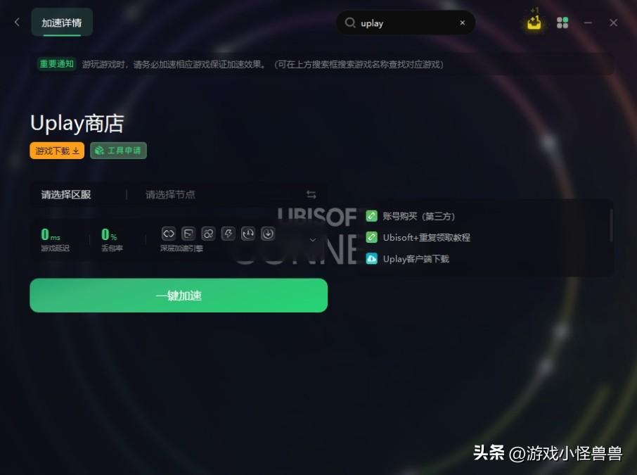 首先咱们得打开奇游这个神器。因为育碧的主机在国外,有时候咱们在国内注册账号会碰到网络不稳定的问题。这时候奇游加速工具就能帮咱们快速连接到育碧的主机啦。