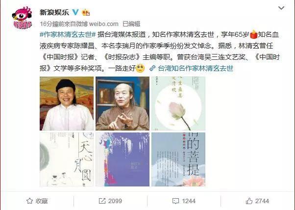 台湾知名作家林清玄突发心梗过世,终年65岁!