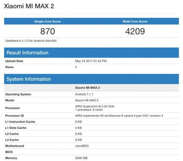 小米Max 2跑分现身Geekbench 配置曝光