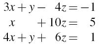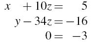 这是一个与原方程组等效的方程组,但最后一个意味着0x+0y+0z = −3, 所以无解。