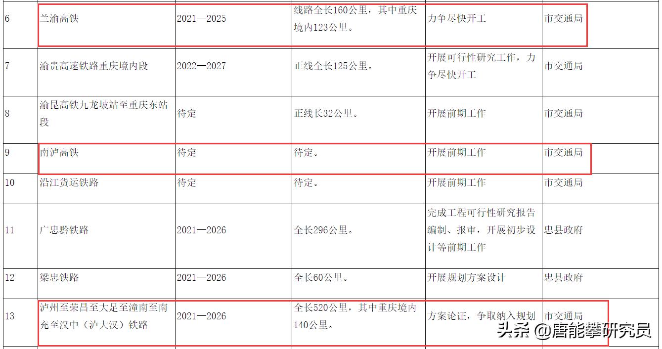 首先看3月2日重庆市《关于做好2020年市级重大项目实施有关工作的通知》,下面是涉及兰渝高铁的表。