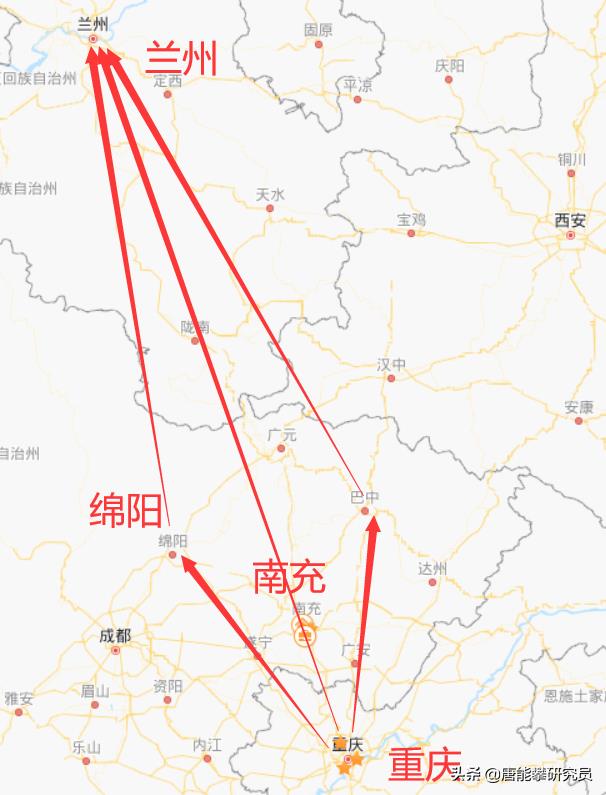 取中走直什么概念?看下图就明白了。重庆-兰州的直线正好经过南充和陇南,走直就是走既有的兰渝普铁路线。重庆-遂宁-绵阳,重庆-南充-广元,重庆-广安-巴中基本在直线上,取中就是不走东线广安渠江流域,也不走西线绵阳涪江流域,而是走中线南充嘉陵江沿线。