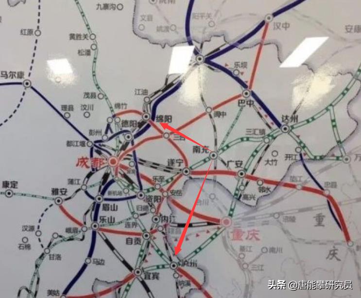 四川十四五铁路规划图:南充已经拥有6射,红色箭头为唐师所加。