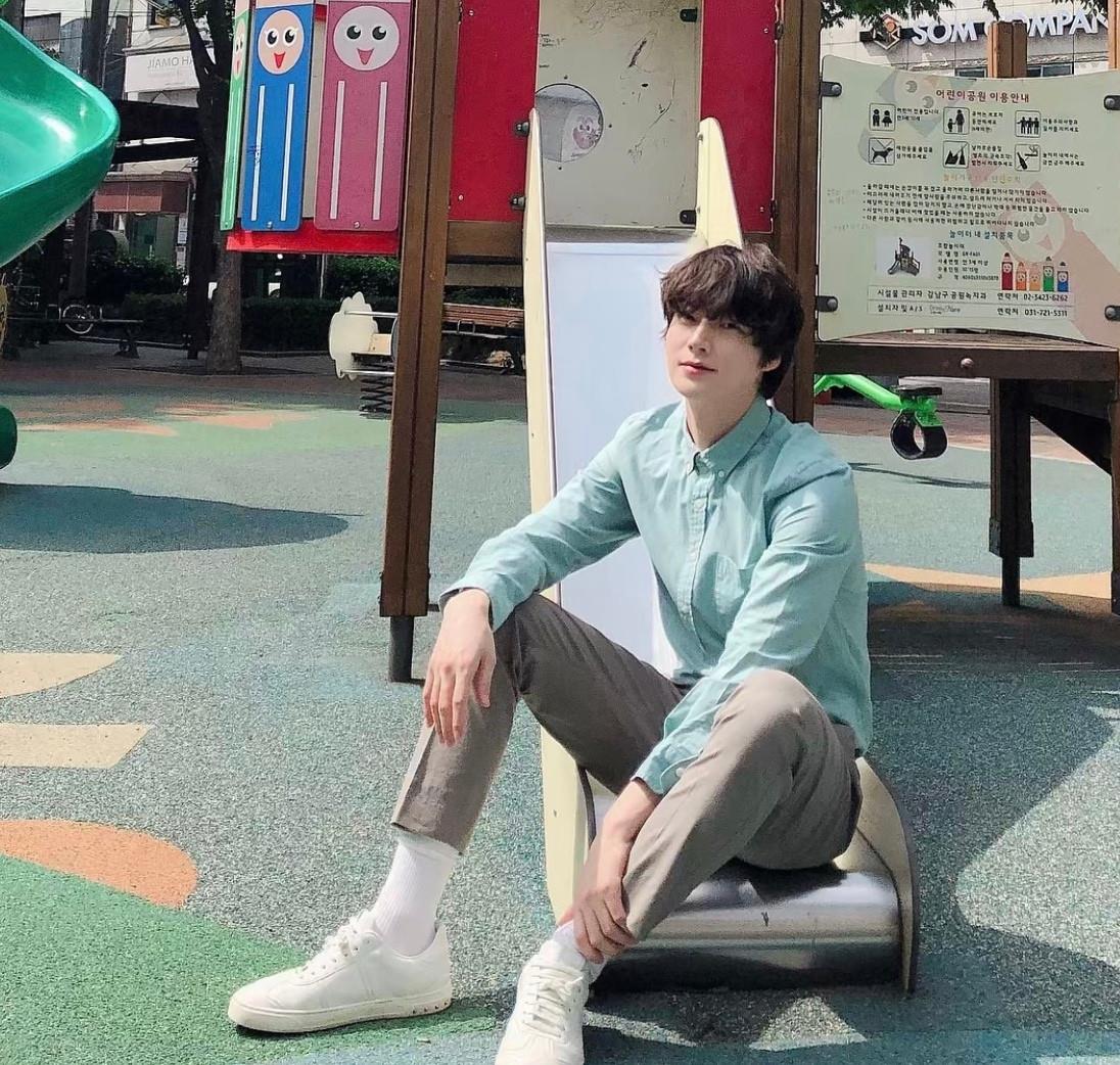 个人觉得安宰贤长相是属于现在比较流行的单眼皮小奶狗风,穿衣风格也很是清爽干净。在以前的动态里,不难发现安宰贤33岁的真实年龄更像20出头的样子,一身墨绿色字母卫衣,袖口的竖条纹假两件装饰十分减龄。下身搭配黑色西装裤和小皮鞋能把韩国小哥哥的大长腿很好的演绎出来。