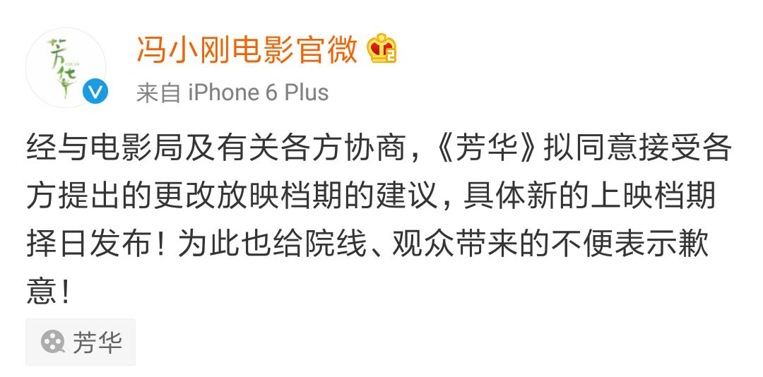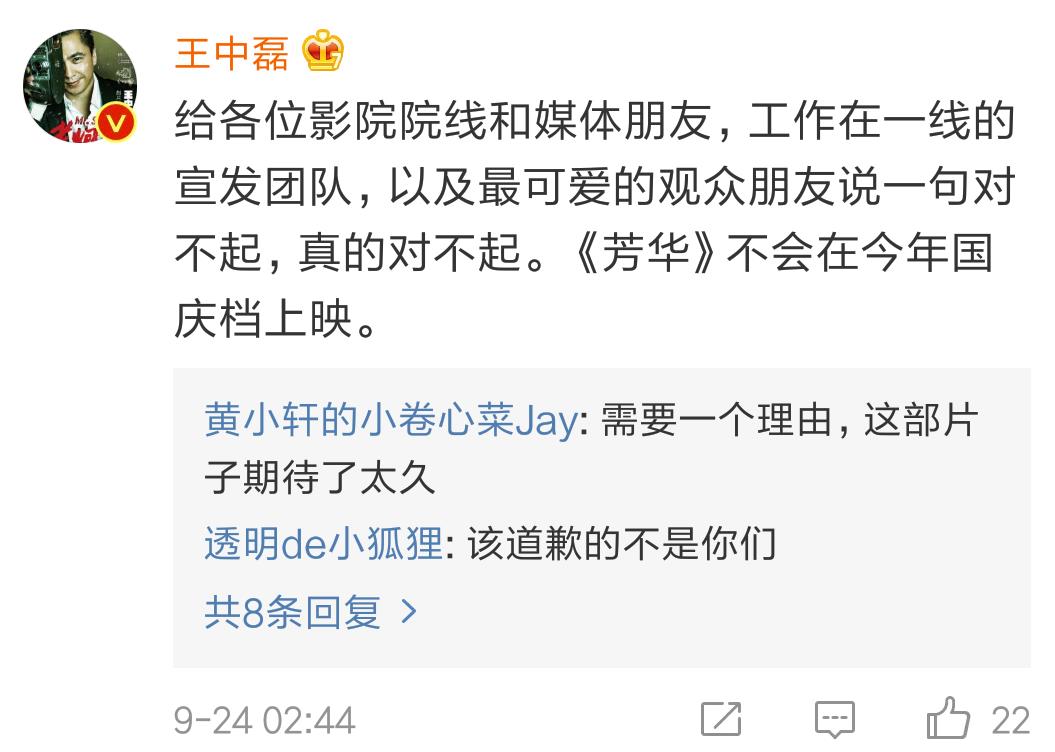华谊方面的王中磊也确定了这个撤档消息,并在微博给观众致歉。