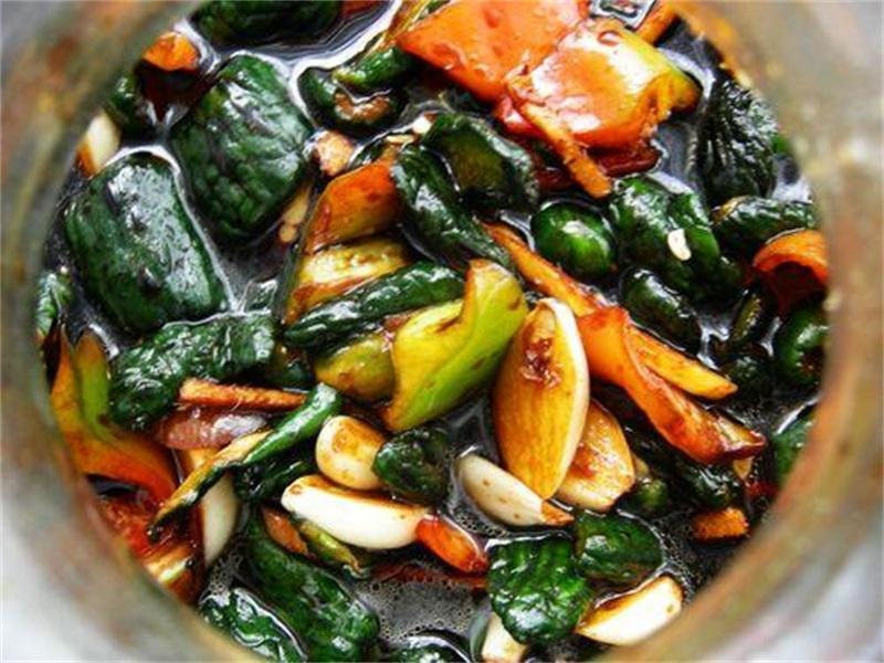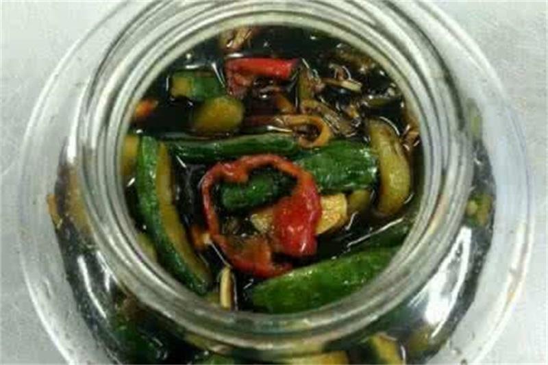 锅里烧油将花椒大料炒香,之后放入酱油,醋,白酒,糖,盐熬开,晾凉以后将黄瓜还有尖椒到在里面,然后放入大蒜片,生姜片,干树椒,一同倒进刷干净的坛子里面,一星期后就能吃了!