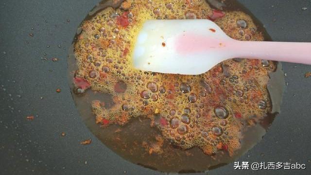 4、然后放入豆瓣酱炒出红油,关火之后利用余温放入生姜和蒜末爆香,加入适量辣椒粉。