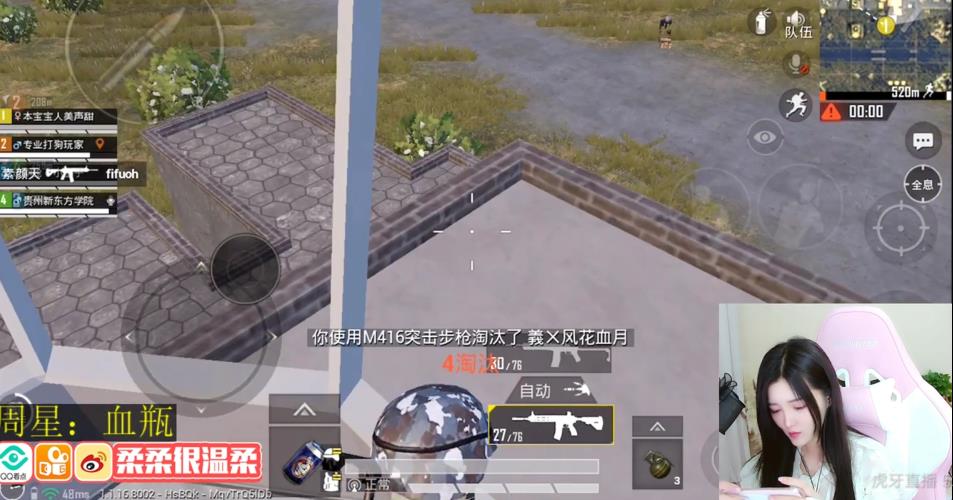 在这场比赛中,虎牙柔柔也是不惧危险,带领着三位路人直接跳了军事基地,对于这个地方很多高手玩家是不敢轻易去跳的,可是柔柔却敢跳,这是因为柔柔确实实力到了。到了军事基地的她也是率先到了卫星楼,在卫星楼展开与敌人的厮杀,也是在卫星楼击败了一个队伍中的两个人。