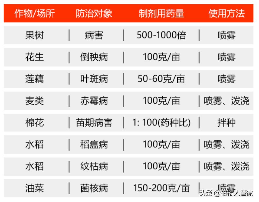 1、多菌灵可用于果树、水稻、花生、棉花、油菜、花卉等作物的叶斑病、赤霉病、菌核病等病害的防治,可采用喷雾、拌种、淋施方式使用,使用方法和倍数可参考下图;