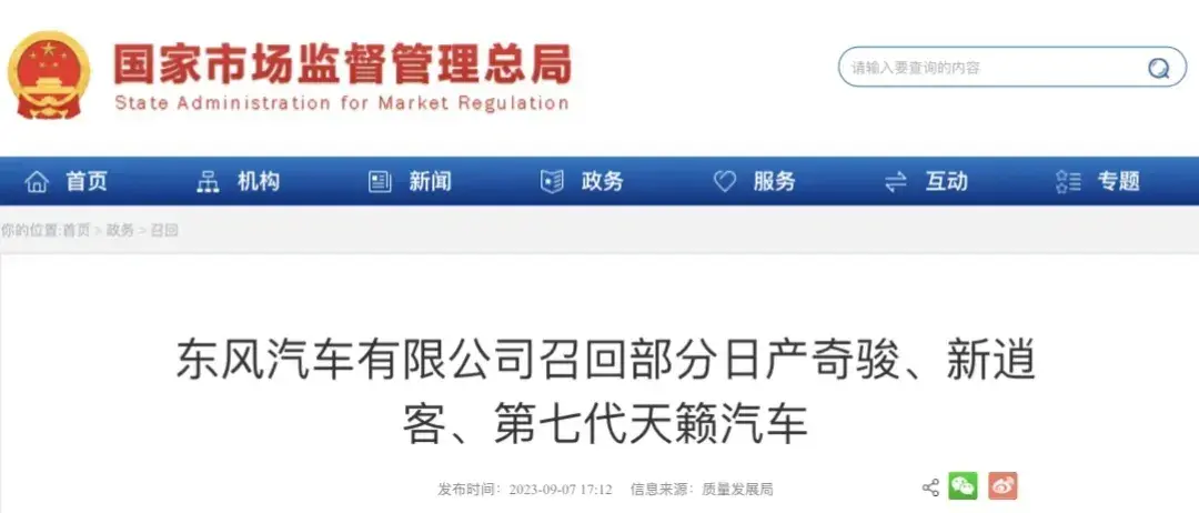 日产将自2023年12月30日起,召回2018年7月23日至2021年9月26日生产的部分奇骏、新逍客、第七代天籁,共计1188020辆。