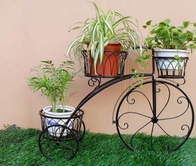 这一款花架图,较为抢眼的是铺在底下的绿色橡胶草皮和造型新颖的花架造型,看起来很像老型的自行车有没有。这一款很好地兼具了实用性和美观性,一次可以摆上三个花盆,又能以弧形来展示。这一款式看起来优雅有富有浪漫的情调来了,博得众多好评,看起来真的很不错呢!