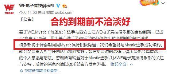 LPL赛区转会期开始,许多战队的选手都开始有了一些变动,但是首先爆出“大料”的居然是WE战队,没想到在为WE征战了这么久的大舅哥居然会离开WE,WE官推:“俱乐部将于转回期间同Mystic保持积极沟通,我们希望能与Mystic选手成功续约”这句话听起来非常怪,为什么在合约到期之前不谈好非要到合约到期成为自由人在进行竞争呢?