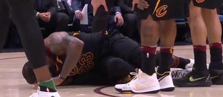 紧接着是詹姆斯在篮下准备指挥队友跑位快攻的时候,小南斯在空中抢篮板中身体失衡,意外地撞到了詹姆斯的右腿胫骨处。詹姆斯当场痛苦倒地。