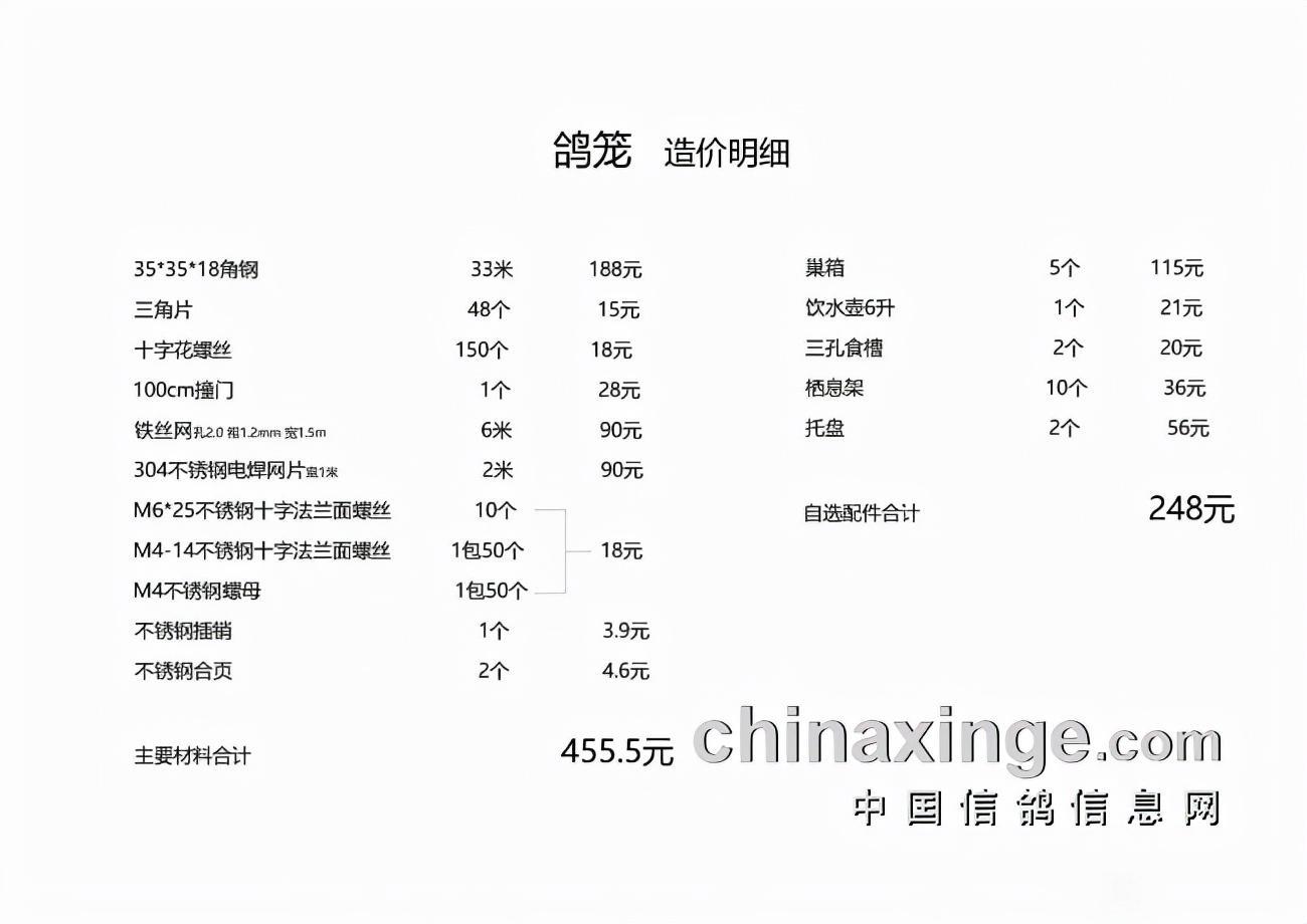 鸽笼主要材料合计455.5元,选配件合计248元,总造价703.5元