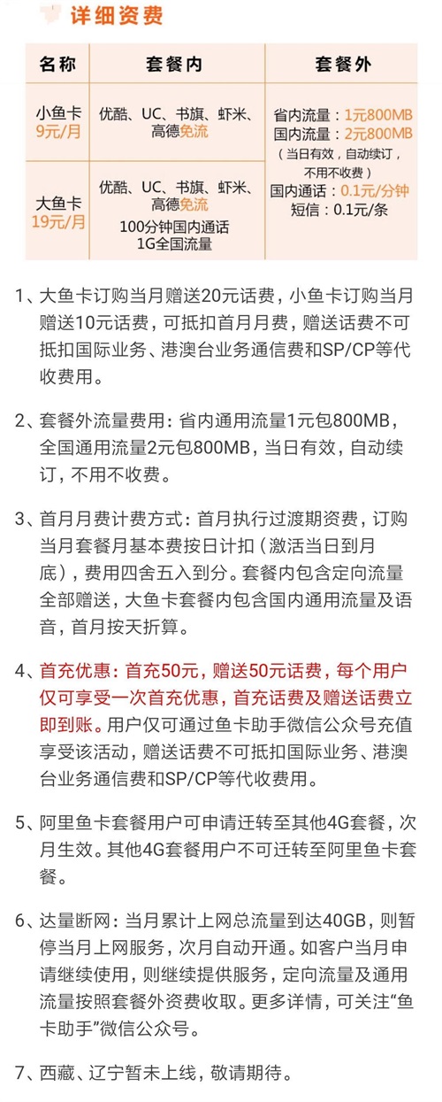 阿里鱼卡是阿里巴巴和电信合作推出的电话卡,阿里鱼卡有小鱼卡和大鱼卡,免流应用主要有优酷、UC、书旗、虾米音乐、高德地图。首充50话费送50话费。资费如下: