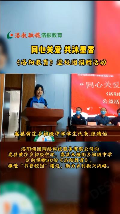 洛阳嗨团网络科技服务有限公司向嵩县黄庄乡初级中学、嵩县木植街乡初级中学定向捐赠502份《洛阳教育》,推进“书香校园”建设,助力乡村振兴战略;