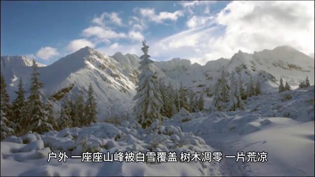 户外一座座山峰被白雪覆盖,树木凋零一片荒凉。在这低温中自然界的一切都失去了生机,小溪凝固成冰,河流封冻甚至连那坚韧的冬青树也低下了头。寒冷统治着这片土地让万物臣服于它的脚下。