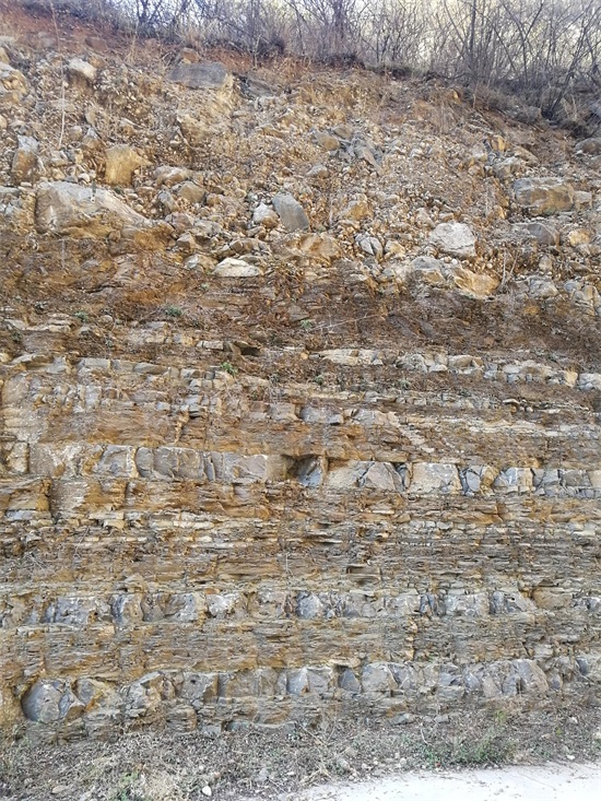 因修路出露的水平岩层。黑白相间的砂页岩互层是不是像夹心饼干?顶部的沙砾层告诉我们,几百万年前河水从那上面奔流而过。