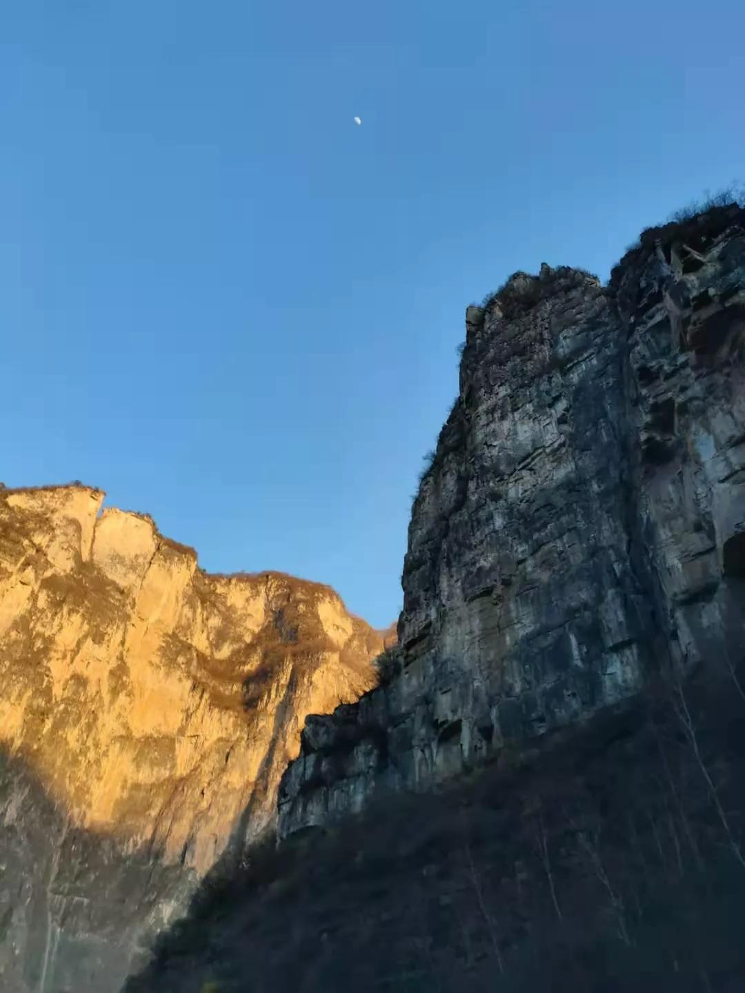 峡谷里明暗两重天,日月共辉映。放大图片可见蓝天上的一轮凸月。