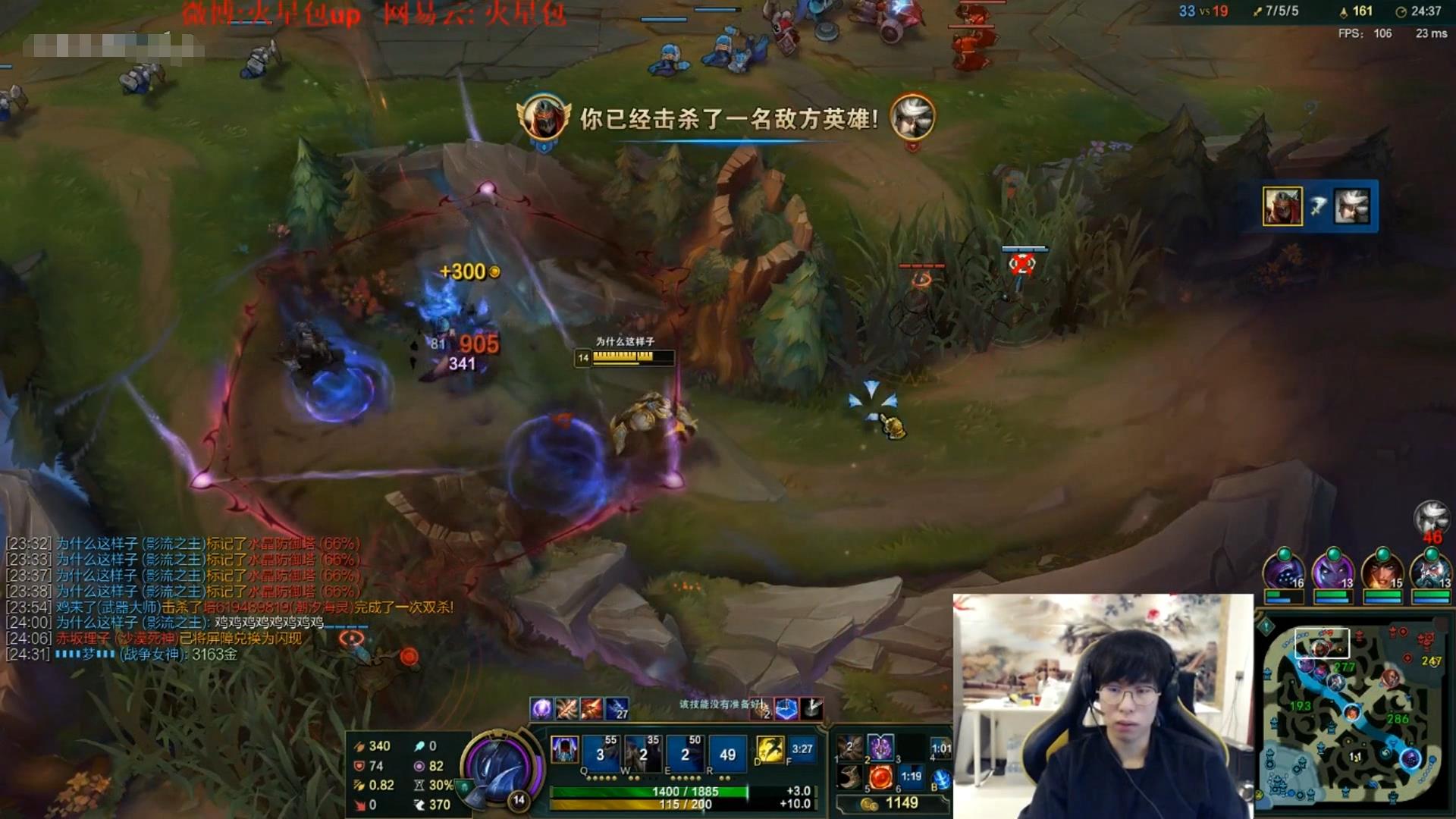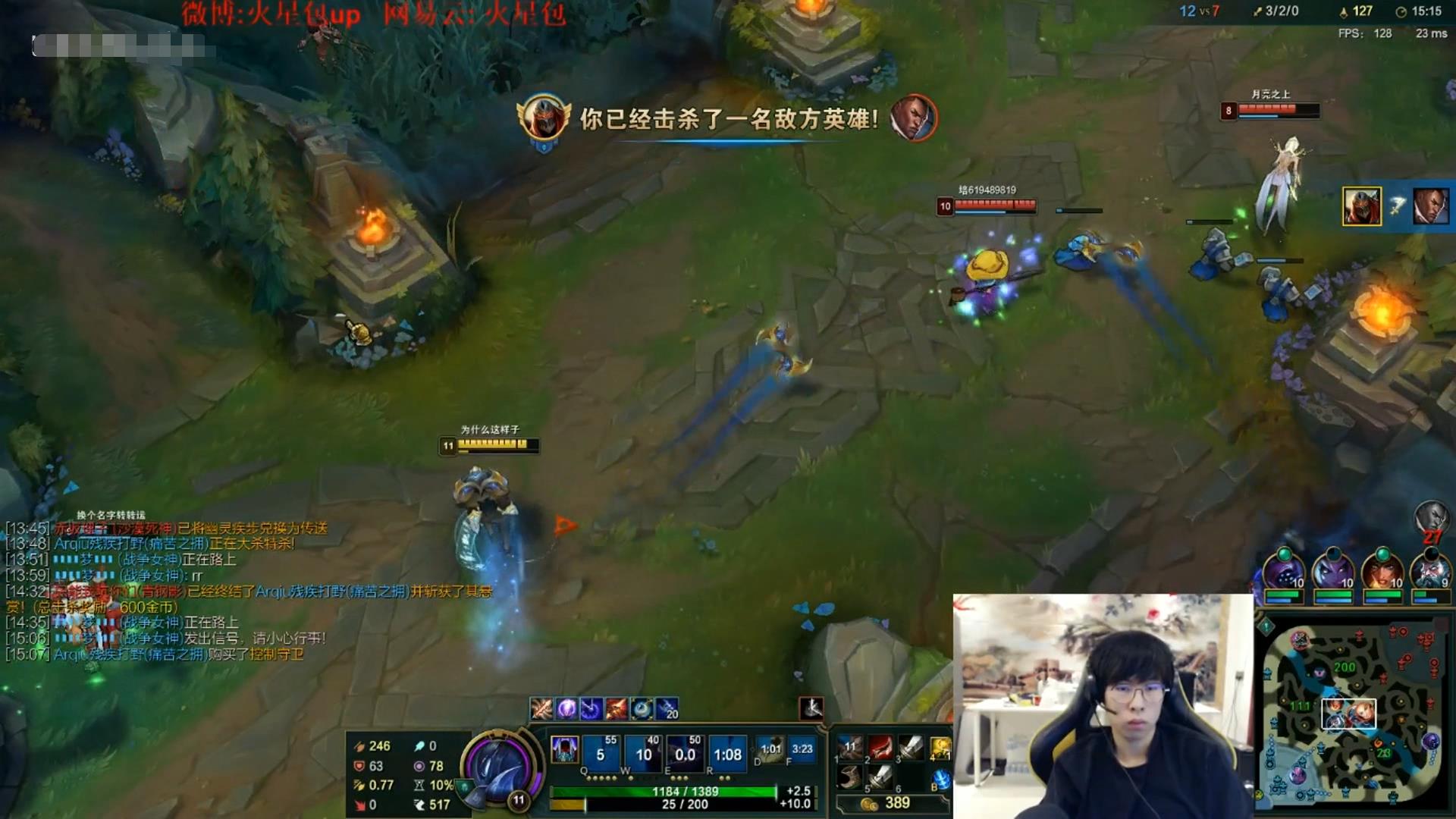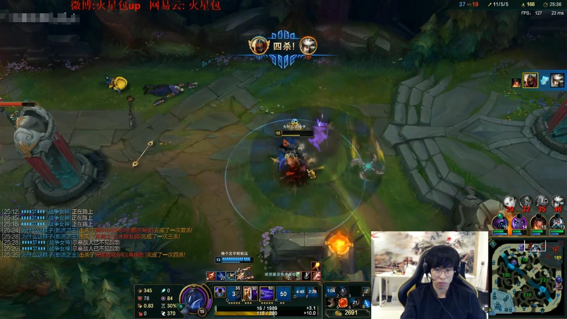 来到中期 ,包子对面青钢影gank时秀了起来,在青钢影使用E技能进草丛时包子丢失了他的视野,不过在青钢影使用2段E技能重新出现时包子在零点几秒时间内R到了青钢影,躲过眩晕并秀杀,击杀后依旧接近满血,对此青钢影玩家也是恼羞成怒在公屏中嘴臭了一句。
