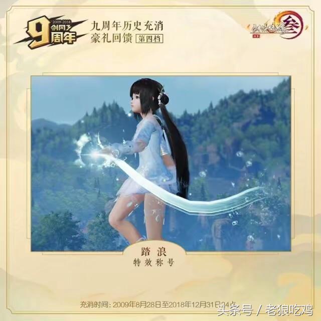 冲销回馈是剑网三最经典的活动,通过玩家之前的冲销记录,来赠送相应的奖励。玩家们众所期待的九周年称号——踏浪,今天也公布到了大家的面前。而“踏浪”的特效也是一道青色的光影,很是漂亮,又到了不能让家人见到冲销记录的时刻了。