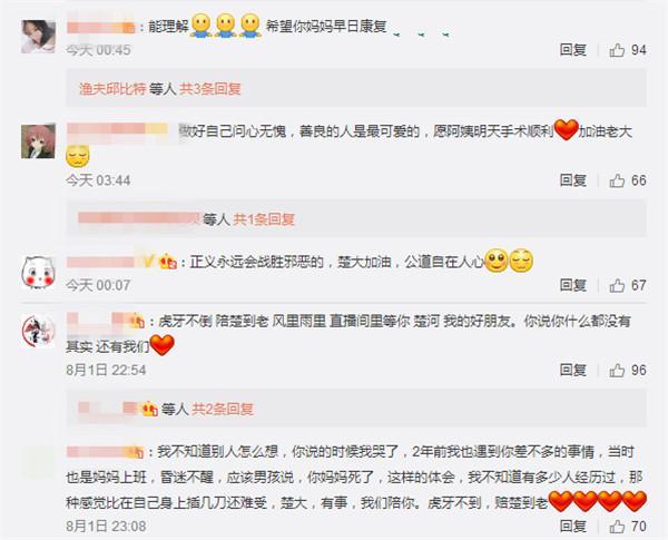 粉丝们看到喜欢的主播被搞成这样子,也是非常心疼,纷纷表示“虎牙不倒,陪楚到老”、“愿阿姨明天手术顺利”、“楚大加油,公道自在人心”。