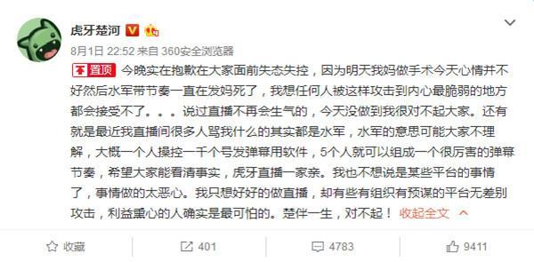 第二天一早楚河就在微博上郑重道歉,因为之前答应过大家直播不会再生气,昨晚没做到很对不起大家。同时楚河也狠怼了一波水军背后的平台:“我也不想说是某些平台的事情了,事情做的太恶心。我只想好好的做直播,却有些有组织有预谋的平台无差别攻击,利益熏心的人确实是最可怕的。”