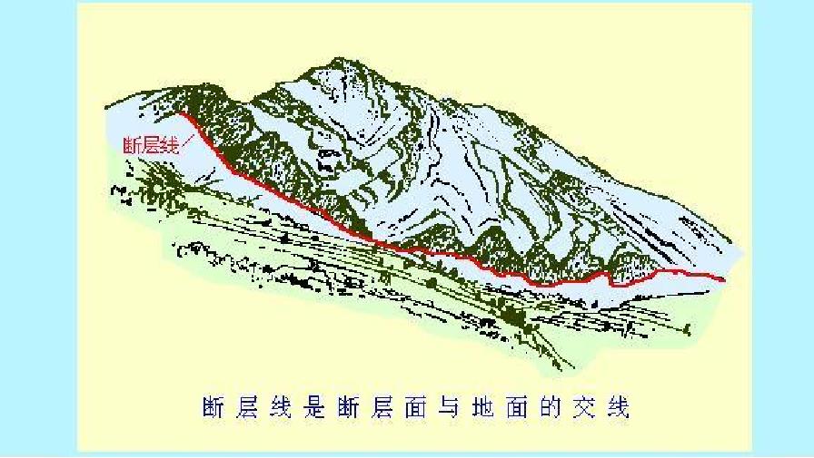 断层面与地面的交线,即断层在地面的出露线。断层线的弯曲形态决定于断层面的弯曲程度、断层面的产状以及地面的起伏,在地面弯曲延伸的规律,与岩层露头线“V”字形规律相同。