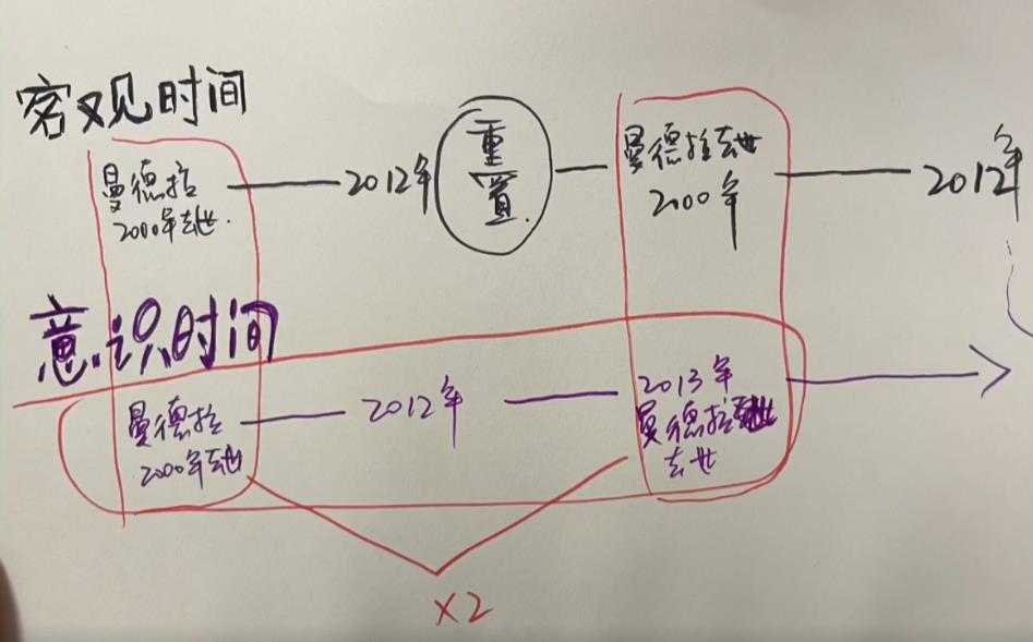 但你如果用重置时空的观点去理解这个问题,给你们画个图你就知道了。一条是客观中的时间线,一条是我们意识中的时间线。假设我们印象当中曼德拉死亡是在这个时间点,然后到了2012年的时候,末日时空被重置了。