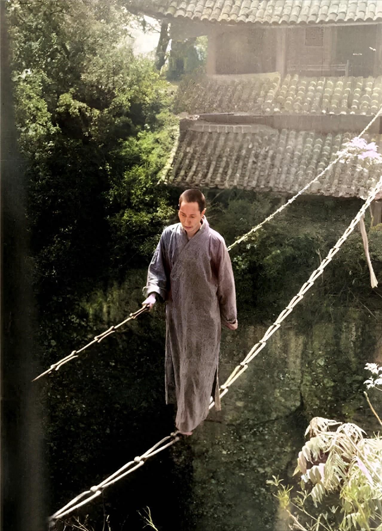 名僧人面色平静,身姿轻盈,正在寺院内练习轻功