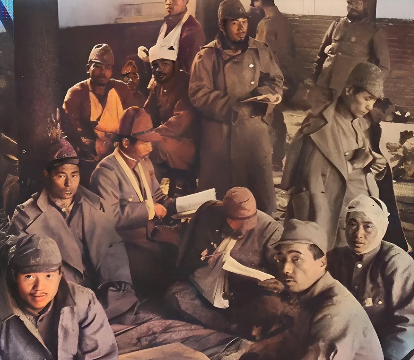 在战火纷飞中,日本鬼子伤兵狼狈而行,血迹斑斑,眼神中透露着绝望与疲惫。