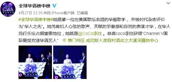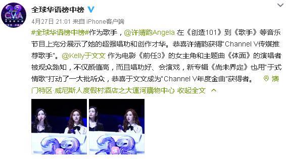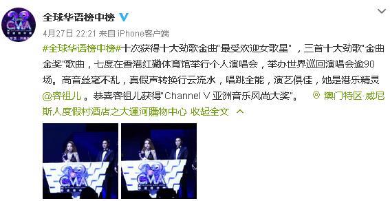 第23届全球华语榜中榜暨亚洲影响力大奖4月27日在澳门举行,黄子韬、容祖儿、杨千嬅、李玟、张杰等出席,现场星光熠熠。