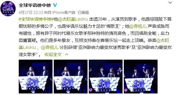 亚洲影响力最受欢迎男(女)歌手——古巨基,容祖儿