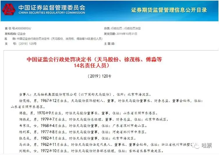2019年11月底,证监会认为*ST天马及徐茂栋等人存在诸多方面的违法行为,并开出了顶格罚单。