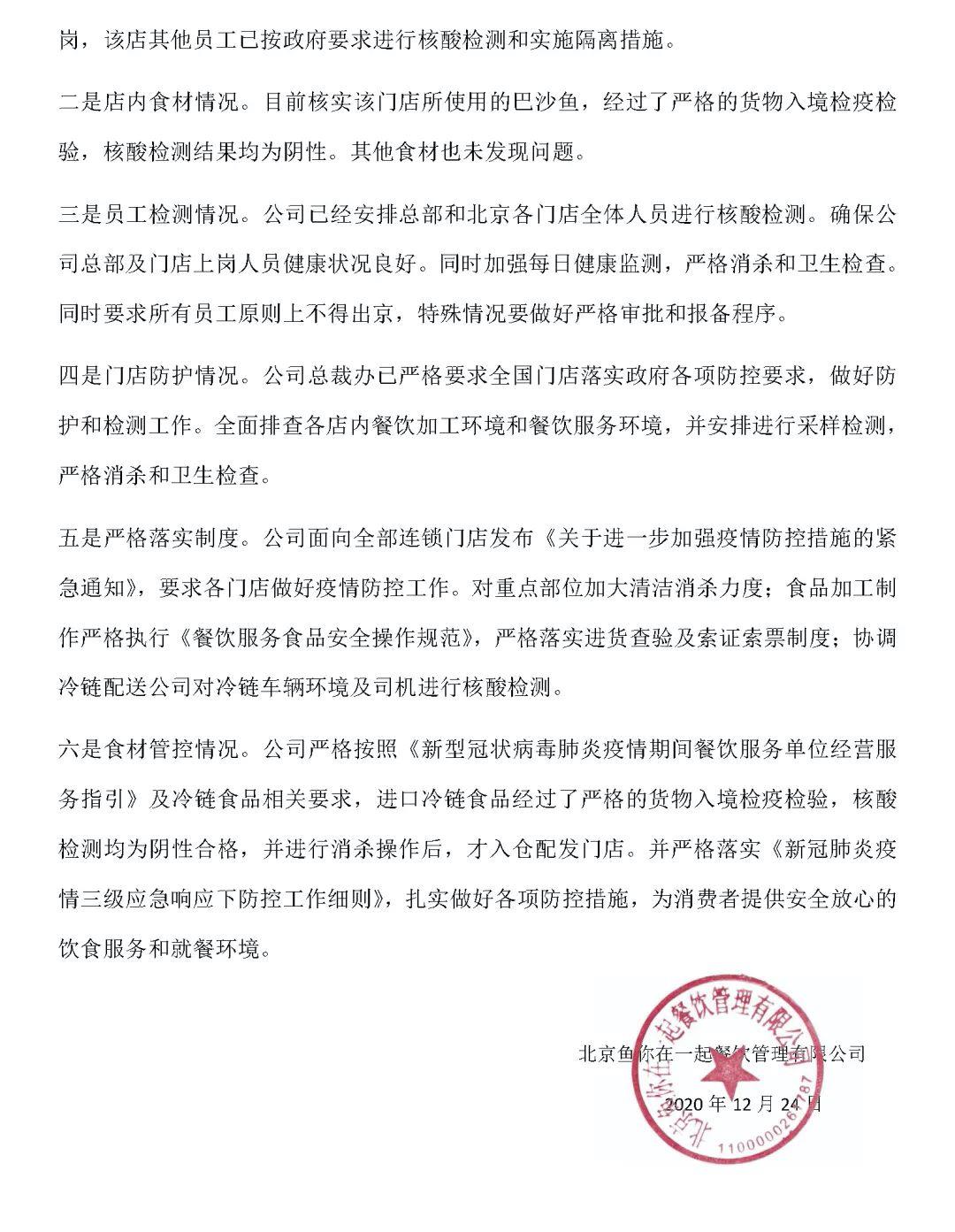 12月24日晚,北京“鱼你在一起”餐饮管理有限公司通过其官方微信公众号发布声明,称涉事门店为加盟店,公司在12月23日晚已经启动疫情防控应急预案。叶某某为新入职该门店两周的员工,该店其他员工已经按照要求进行核酸检测和实施隔离措施。
