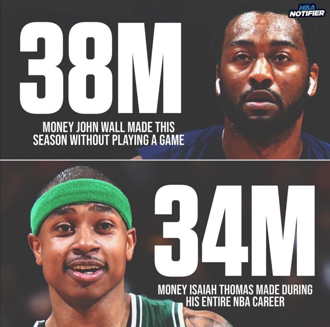 虎扑6月15日讯 近日媒体NBAnotifier晒出了一张以赛亚-托马斯生涯薪水和约翰-沃尔本赛季薪水的对比图。