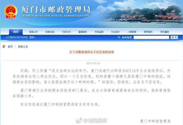 晨报讯(记者 李凌)针对近期网上盛传厦门快递行业 8 月 15 日起停运” 的消息,厦门市邮政管理局回应称,此消息不属实。