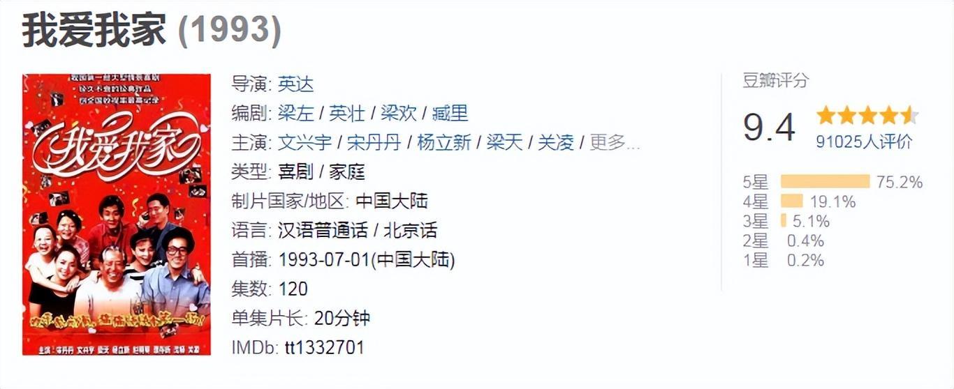宋丹丹主演的《我爱我家》在豆瓣评分上依旧保持在9.4,7成多人打出5星,甚至要比《编辑部的故事》分数还要高。