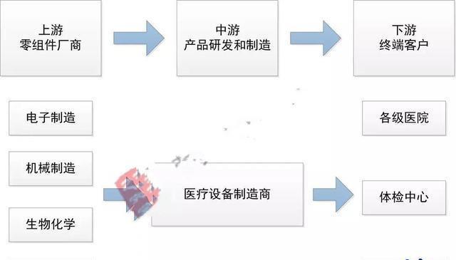 医疗设备的上游行业主要包括电子制造、机械制造、生物化学、材料等行业;下游行业为医疗卫生行业,包括各类医院、体检中心等。