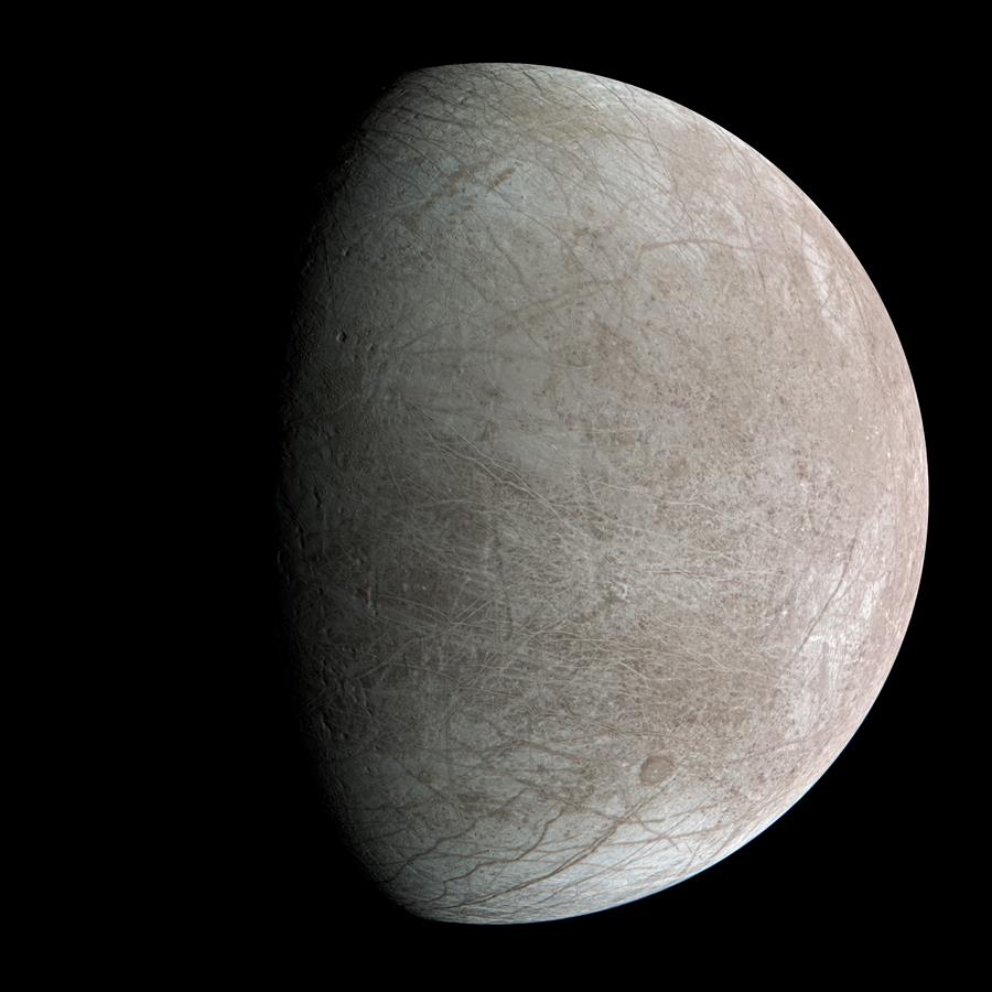 △木卫二,拥有太阳系中任何已知固体天体中最光滑的表面,据猜测其冰盖下可能存在生命。图/Wikipedia