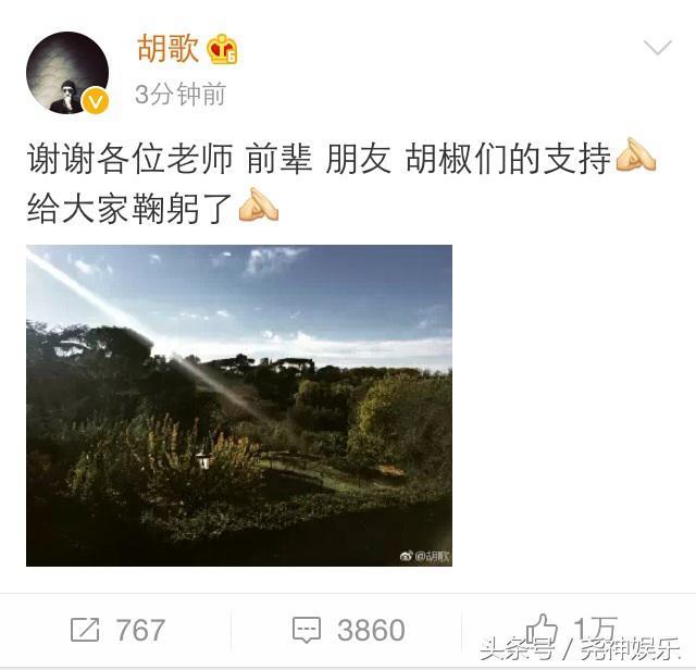 临近深夜12点,胡歌更新微博:谢谢各位老师 前辈 朋友 胡椒们的支持[作揖] 给大家鞠躬了[作揖]