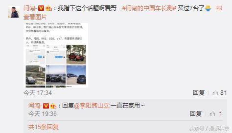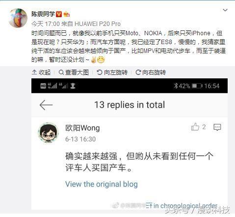 今天,陈震针对网友评论的“确实越来越强,但从未看到任何一个平车人买国产车”发表微博称:“时间问题而已,就像我以前手机只买Moto、NOKIA,后来只买iPhone,但是现在呢?只买华为;而汽车方面呢,我已经定了ES8,慢慢的,我猜家里纯干活的车应该会越来越倾向于国产,比如MPV和电动代步车,而至于装逼的嘛,暂时还没计划。”即便是有粉丝问:“你要是只有一张手机卡,还用华为吗?”陈震仍肯定表示“用”。