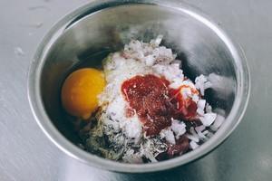 猪里脊肉剁碎后用少许嫩肉粉抓匀。洋葱切碎末后加入肉末内,再加入一个鸡蛋、少许番茄酱、一点盐和黑胡椒粉抓匀后用筷子搅上劲。