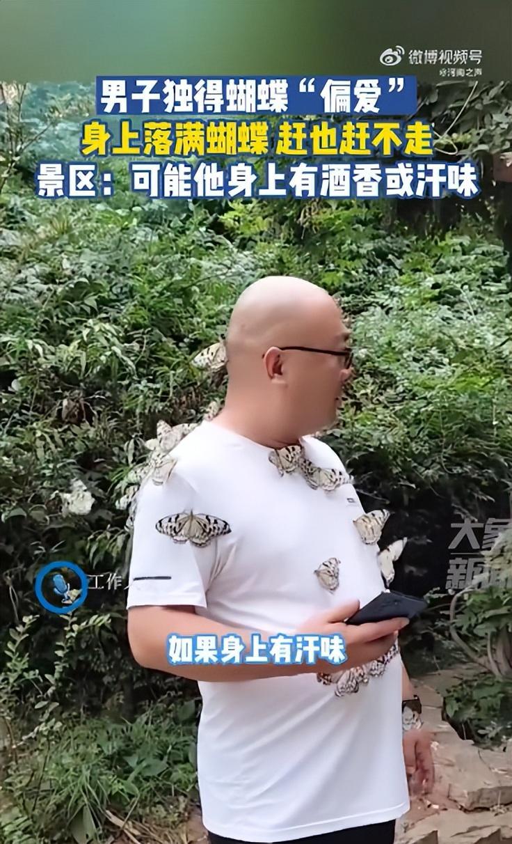 男版含香!山东一景区男子独得蝴蝶偏爱,身上落满蝴蝶赶也赶不走,景区工作人员:可能他身上有酒香或汗味
