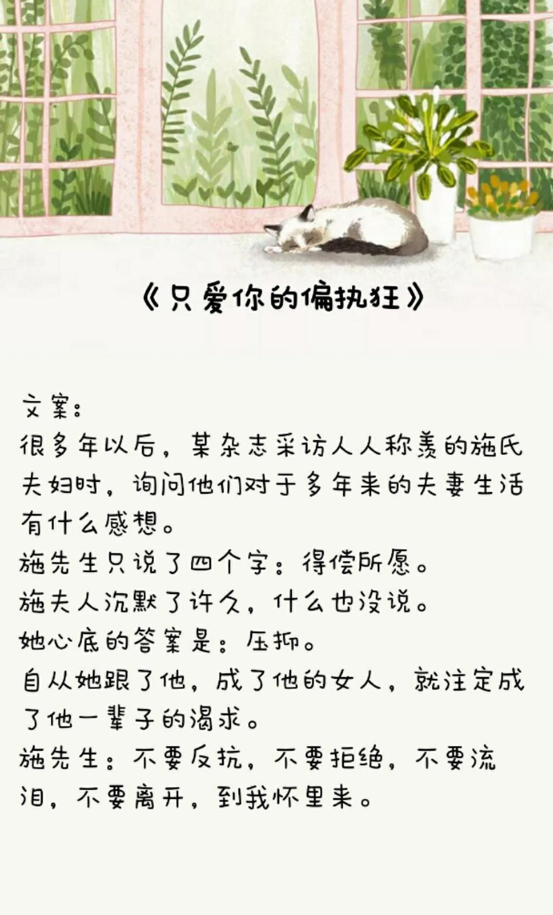 短评:1V1甜宠微虐随时甜甜甜,女主弱弱弱,娇娇娇。男主占有欲超强,偏执又强势,轻微变态。有点强取豪夺类型的文,女主前期不但不爱男主,还有点恨男主。男主囚禁女主,不让女主接触外面的世界,男主特别怕女主离开他。不过最后结局he,女主终于爱上了男主。